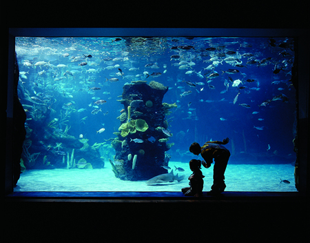The walls of the lobby have various tanks housing a wide variety of fish and specimens.